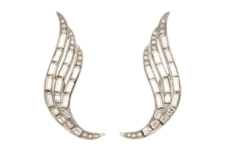 レクタングルのクリスタルストラスが散りばめられた、ハンドメイドのシルバートーンのピアス。カーヴィーなエンジェルウィングをモチーフに耳元を大胆に飾ります。シンプルなデイリースタイルからドレスシーンまで幅広くマッチ。