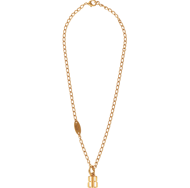 BBのロゴチャームが存在感たっぷりのチェーンネックレス。適度にボリュームのあるゴールドカラーのチェーンとプレートがスタイリングにエッジーなムードを演出。シンプルな着こなしのアクセントに、サラリと着けたい。