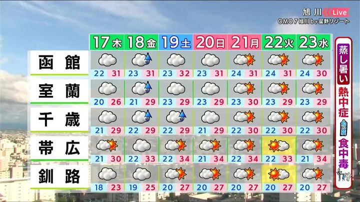 金曜と土曜は西部でにわか雨があるでしょう。道東は金曜は曇りますが、3連休は日差しが出ます。蒸し暑さが続くため、熱中症や食中毒に注意が必要です。