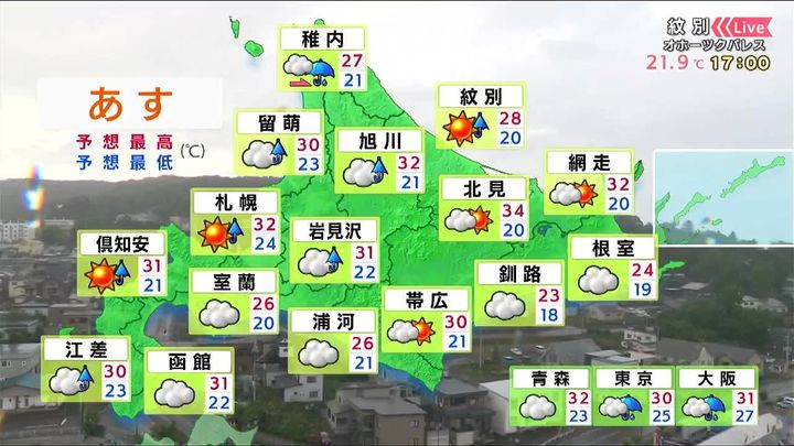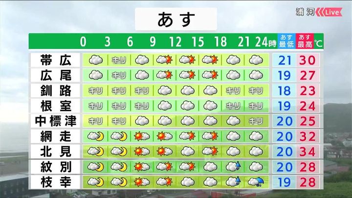 日ざしが出ますが、釧路や根室は霧がかかるでしょう。オホーツク海側は午後は所々でにわか雨がありそうです。北見の最高気温は34度です。室内でも風通しをよくしましょう。
