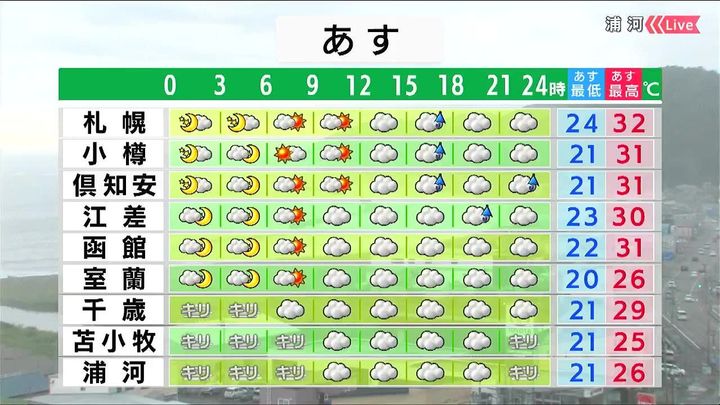 札幌周辺は日差しが出ますが、夕方以降にわか雨があるでしょう。太平洋側は低い雲や霧がかかります。札幌の最高気温は32度。激しい運動は避けるなど、熱中症対策が必要です。