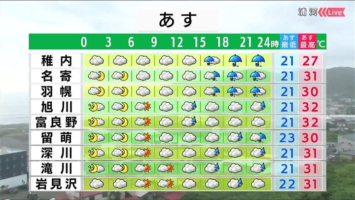 朝、晴れていても雨具が必要です。午後は雨が降り、雷を伴うおそれがあります。稚内周辺では夜は激しい雷雨に注意して下さい。旭川の最高気温は32度。4日連続で真夏日になりそうです。