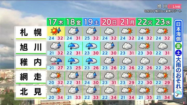 金曜から土曜にかけて日本海側で次々に活発な雨雲がかかり、大雨になるおそれがあります。札幌やオホーツク海側では大雨にはなりませんが、金曜と土曜は急な強い雨に注意して下さい。