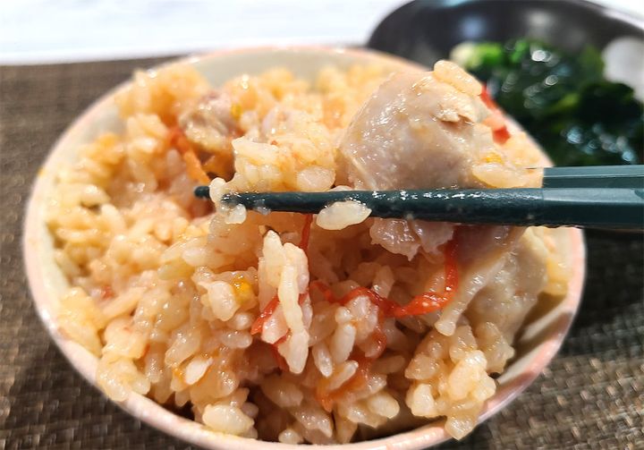 切らずに全部放り込んじゃって大丈夫…なの!?と不安でしたが、炊き上がってしまえば心配無用でした。いい感じにほぐしやすく炊きあがっていて、ゴロッとした鶏もも肉もホロホロです♪切らないから包丁要らずだし、もちろん洗い物も極少です。