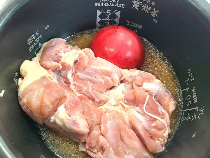 4. 鶏もも肉とヘタを取ったトマトを、切らずにそのまま炊飯器に乗せて普通炊飯します。