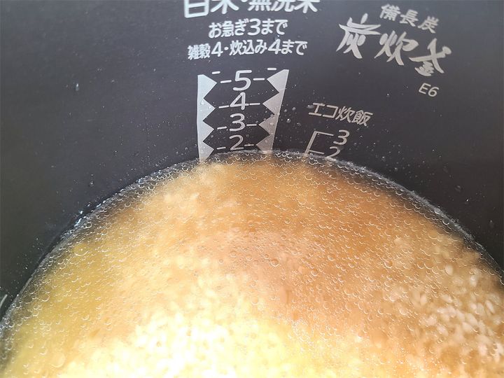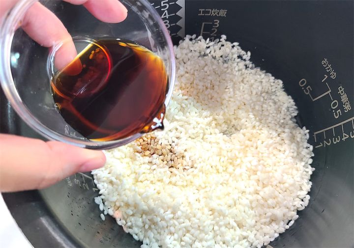 3. 水(分量外)を炊飯器の1.5合のラインまで注ぎます。