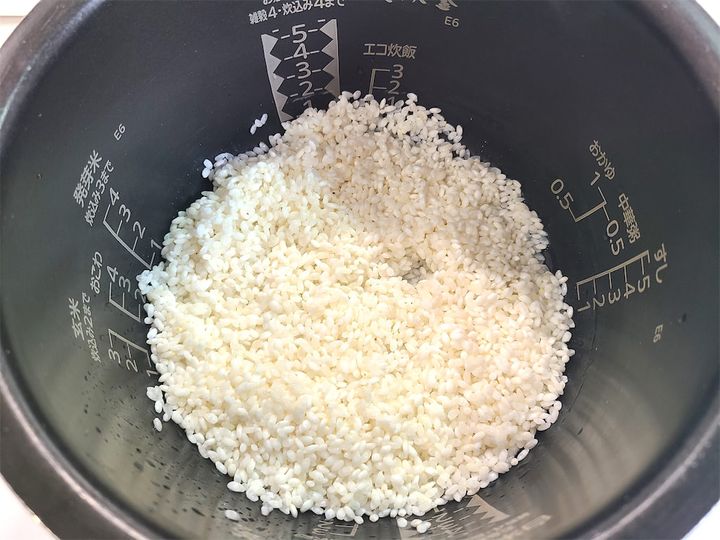 1. 米を研ぎ、水を切って炊飯器に移します。