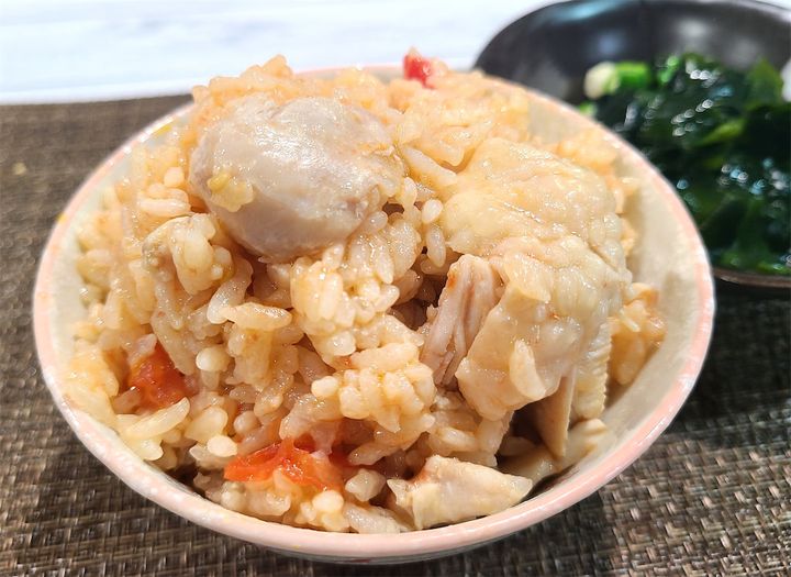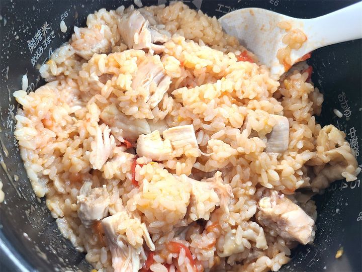 5. 炊き上がったら、しゃもじで鶏もも肉とトマトを崩しながら混ぜて完成です♪