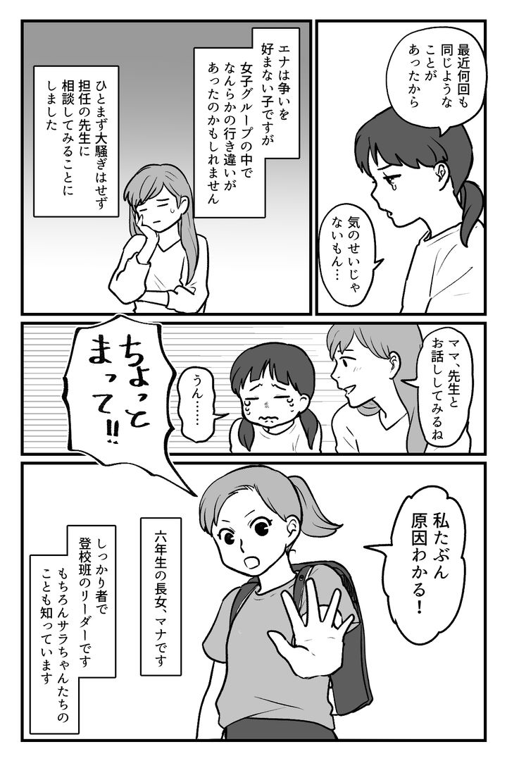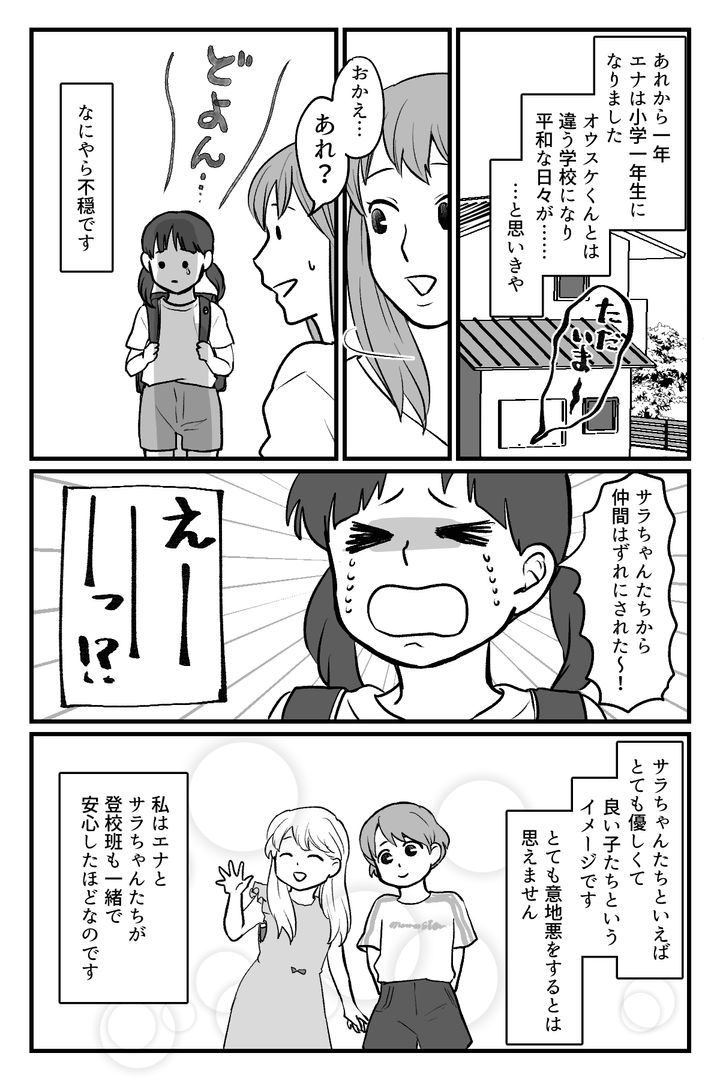 私は30代の主婦です。2人の小学生の娘がいます。長女のマナは小学6年生に、次女のエナは小学1年生になりました。エナが通っていた幼稚園ではくりかえし意地悪をしては、その場しのぎで謝って許してもらおうとするオウスケくんという男の子がいました。エナは度重なる意地悪にストレスを溜めていました。自分なりの解決法を見つけながら成長していき、悩みの種だったオウスケくんとは違う小学校になりました。平和な日々が来たと思っていたのも束の間、なにやら不穏な空気です……。