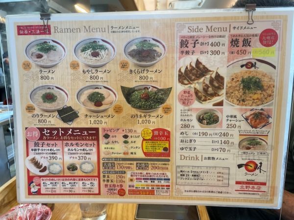 カウンター席には、臨席との間にメニューが掲示されていました。 基本のラーメンに、もやし、きくらげ、のり、チャーシュー、のりネギをトッピングしたラーメン。 餃子に白米をセットにした餃子セット、ホルモンに白米をセットにしたホルモンセット。 後から来たお客さんは、ホルモンセットの注文が連続していたので、相当な人気セットなんでしょうね。