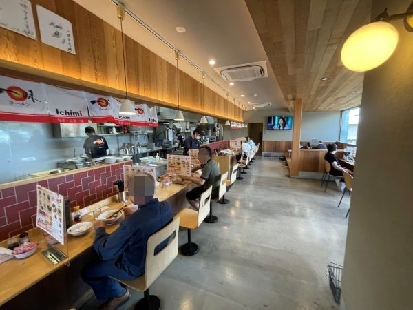 店内に入るとスタッフさんの明るく大きな声で出迎えて頂けます。中は広くて、とても明るい開放的な雰囲気です。 厨房に面してフロアーにはカウンター席、窓際に4人掛け×2、2人掛け×1のテーブル席と、小上がりに4人掛け×2のテーブル席があります。 訪問時は土曜日の14時半ですが、7割方の席が埋まっていました。昼のピーク時には相当なお客さんで溢れる超人気店のようです。