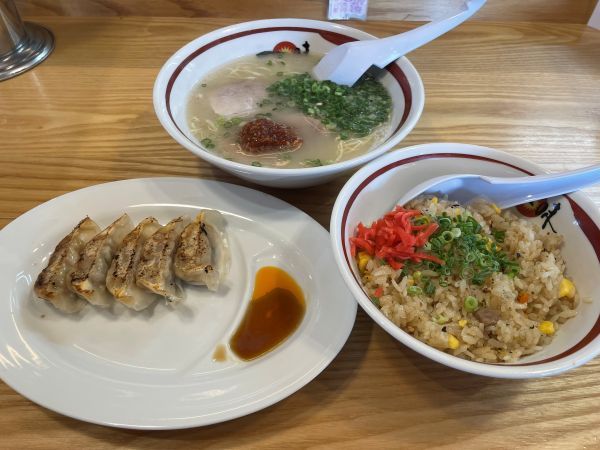 さて、本日オーダーしたラインナップです。結局、あれも、これも注文してしまいました。 先ほどのラーメンの他、半餃子(300円)、焼飯(並450円)に替玉(150円)。 見た目通りのボリュームで、間違いなく今日もやっちゃいました。