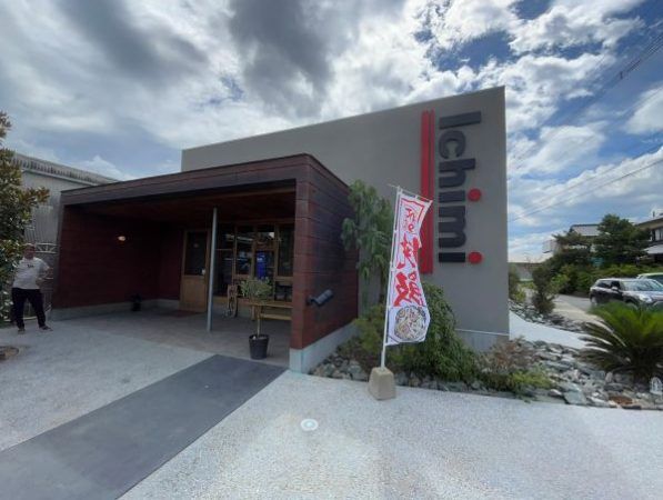 カーナビの「目的地近くです!」の案内が聞こえると、このようなスタイリッシュな建物の登場です。 カフェか、ブテックか‥建物の ”Ichimi” の看板と、のぼり旗の焼飯から「一味」と確信できます。