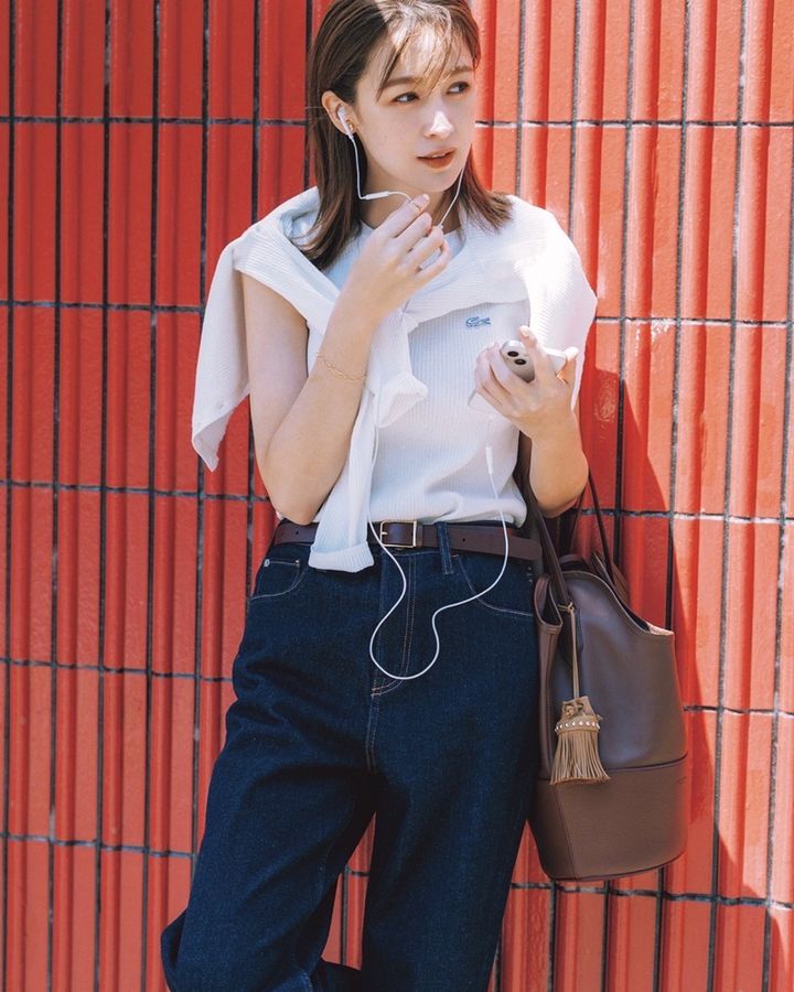 7月17日(木)、ドライな着心地とUVカット機能付きが魅力的なラコステのアンサンブルニットは、夏の通勤にぴったり。肩掛けしたVネックカーで寒暖差対策も抜かりなし。白×ブラウンの配色が爽やかさと知的さを両立し、王道カジュアルを洗練されたムードに更新してくれます。
