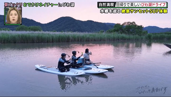 そして日も傾いてきたころ、本日ラストとなるスポットへ。ここで体験できるのは、近江八幡に広がる水路を巡る「水郷SUP」。SUPとは水面に浮かぶボードの上に立ち、パドルを漕ぎながら進む水上アクティビティで、海や湖に比べて風が少なく、難易度の低い水路巡りは初心者にもオススメという。「絶対やる!」と前のめりな村田と池田は、夕暮れどきに最高の景色が楽しめるというイチオシポイントを目指して漕ぎ出していき…。「プライベートで来てたら泣いちゃうかも」と池田を感動させ、「人生振り返ってしまうわ…」と村田をしみじみさせた胸に迫る絶景に、スタジオのやすともも大興奮!