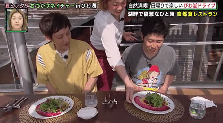続いて訪れたのは、琵琶湖畔にある自然派レストラン。こちらでは地元の食材をふんだんに使ったランチコースを堪能する。近江牛たっぷりの贅沢ハンバーグや、魚介のだしをきかせた絶品パスタに村田と池田が悶絶!?