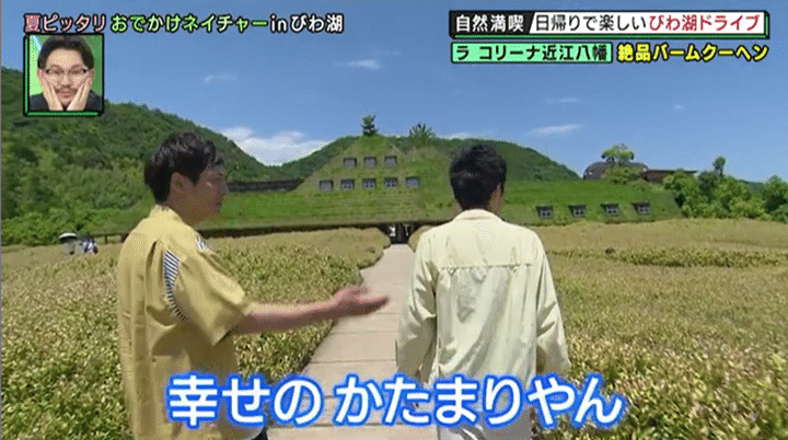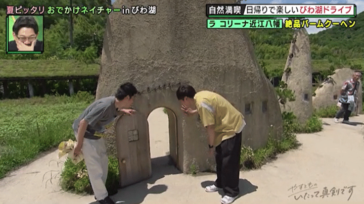最初にやって来たのは、滋賀で今、大人気という注目のスポット。見渡す限りの緑の中に、屋根を草で覆われた不思議な建物が佇むファンタジックな光景に「ジブリ感がすごい!」と村田も驚いたこちらは、バームクーヘンで有名なお菓子メーカーが手がける施設。ショッピングや工場見学、出来たてのバームクーヘンがいただけるカフェなどが楽しめるお菓子のテーマパークだ。甲子園3個分という広大な敷地の中には田んぼや里山が広がり、豊かな自然と思う存分ふれあえるほか、草木を使って思い思いのイメージを形にする“寄せ植え”のワークショップも。興味津々の2人がさっそく寄せ植え作品を作ってみると…。池田が思わず「怖ぇ〜!」と叫んだ、あまりにもリアリティにあふれすぎている村田の問題作とは?