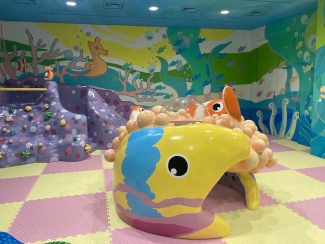 小さな子ども連れには嬉しいキッズルームも完備。海をイメージしたかわいい空間には、クマノミとウツボがモデルのオブジェや浅瀬の磯をイメージしたすべり台などがあります。元気いっぱい体を動かすのはもちろん、写真撮影にもぴったりです。