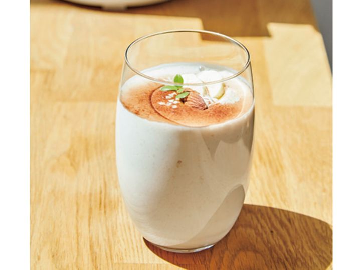 「幸せホルモン」ともいわれるセロトニンは、夜になると睡眠に有効なメラトニンに変化。朝はそのセロトニンのもととなるトリプトファンを含む食品を簡単にジュースで取ります。バナナ・豆乳・ナッツがおすすめ。