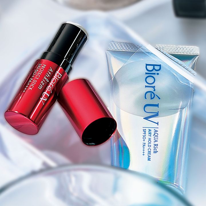 左:高温多湿な環境でも汗・蒸れ・擦れに強く落ちにくい。SPF50+・PA++++ 10g¥1,980※店舗限定、右:湿度に応じて膜の厚みが変化し、肌が呼吸するかのような軽い塗り心地を実現。SPF50+・PA++++ 70g¥1,430〈ともに編集部調べ〉(ともに花王)
