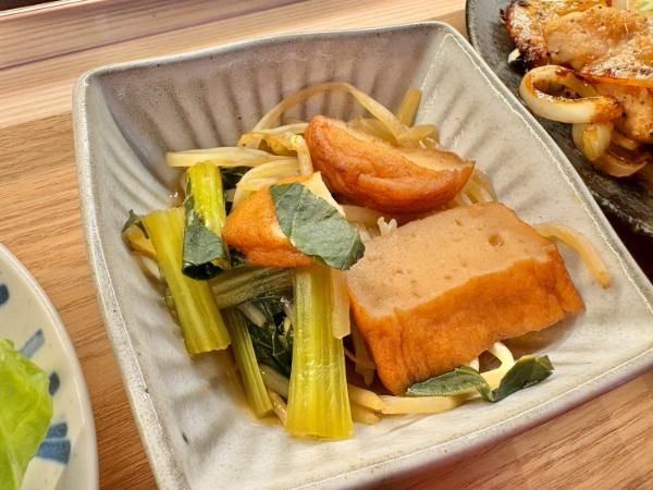 もやしとさつま揚げの煮びたし。青菜も入っていて、野菜の食感もありつつ、旨味がじゅわ~!