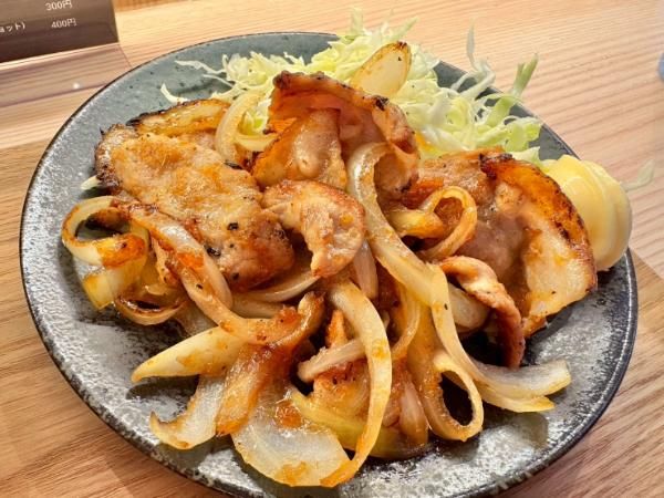 メインの豚バラ生姜焼き!生姜がきいていてご飯が進むお味。作り立てなのでホッカホカ!たっぷりのキャベツと添えられたマヨネーズも嬉しい♪