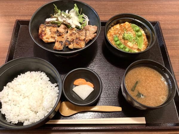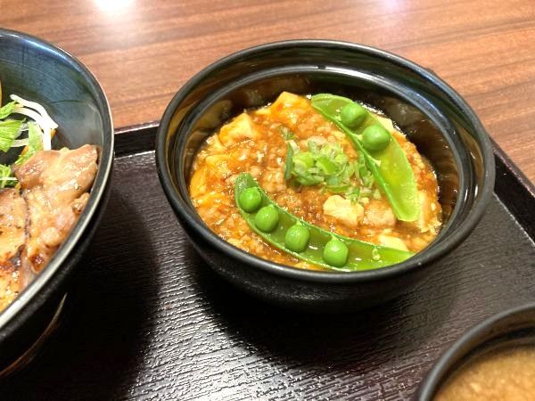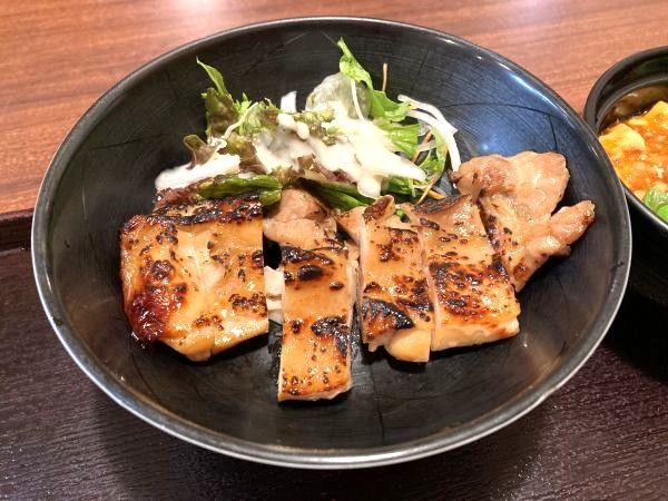 「麻婆豆腐」はひき肉がたっぷり入っていて甘辛い味付けが美味しく、ごはんを少なめにしてもらったことをちょっぴり後悔。味噌汁はあら汁風で魚介の出汁がきいていました~。
