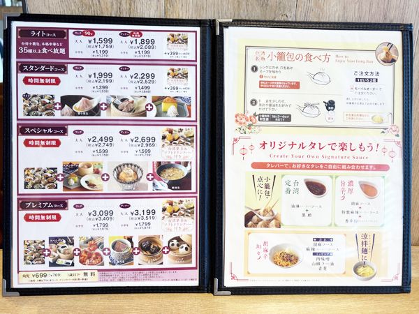 「サービスコース」は通常の食べ放題に加え、小籠包、蟹小籠包、胡麻団子、デザート3種盛り、台湾菓茶付きドリンクバーが付きます。小籠包、蟹小籠包、胡麻団子、デザート3種盛りは、オーダーごとにテーブルまで運んでくれるので、できたての熱々が楽しめるのがうれしいところ。