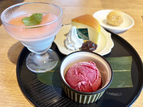 そして、大きな魅力なのが「デザート3種盛り」。台湾カステラ、白桃のパンナコッタ、カシスシャーベットのプレートです。台湾カステラは、ふっわふわの食感で軽やか。ホイップクリームとあんこと一緒に食べれば、甘さにコクが増しました。白桃のパンナコッタは、なめらかな食感。ミルクの風味が新鮮でした。カシスシャーベットの甘酸っぱさは、食後のシメとしてもぴったりでした。