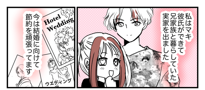 私はマキ(26)。独身です。20歳前に両親を亡くし、そこからはお兄ちゃん家族と実家で暮らしていました。けれど彼氏(ツバサ/26歳)ができたことがきっかけで一人暮らしを始めました。最近ではツバサもうちにいる時間が増え、プチ同棲のような感じです。結婚式も挙げたいし子どもも欲しいし、お金が貯まったら結婚しようと約束をして、日々節約に励んでいます。切り詰められるところは切り詰めているので……食材などはお兄ちゃんの許可の元、実家からもらっているのですが……。