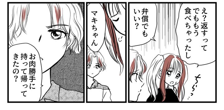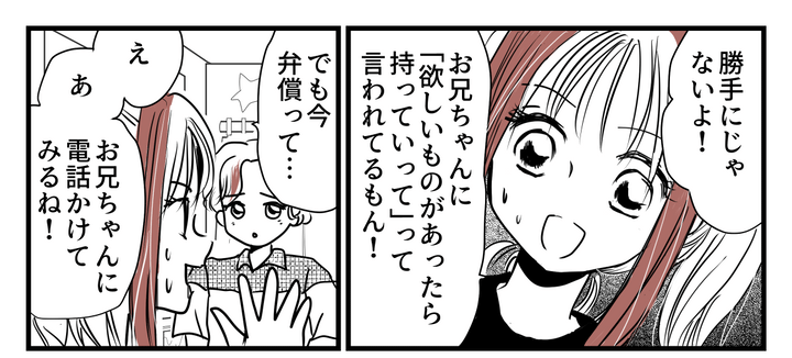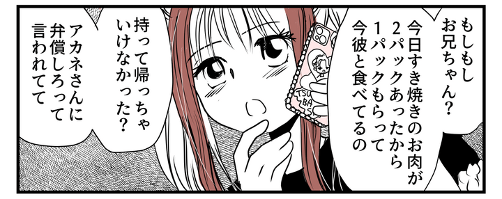 実はこのいいお肉……義姉のアカネちゃんには黙って冷蔵庫から持ってきていたのです。アカネちゃんから電話がかかってきて「弁償して」と言われてしまいました。電話口のアカネちゃんは怒っていたように感じました。困った私は、お兄ちゃんにヘルプの電話をしたのでした。