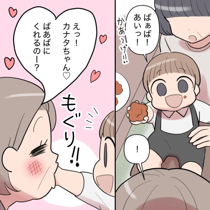 そこに、「ばぁば!あいっ!かあ~げ!」とカナタが握りしめていたからあげを差し出すと、「えっ!カナタちゃん!ばあばにくれるのー?」とカナタくんの手をそのまま口にくわえてからあげをパクリ!