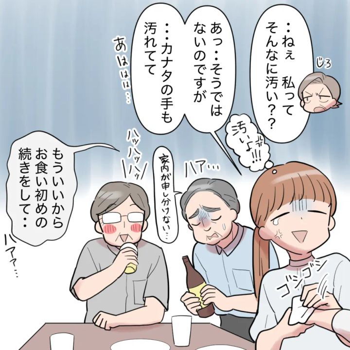 「あっ・・そうではないのですが・・カナタの手も汚れてて。あははは・・」と言い訳しつつ「汚いよ!!」と心の中で呟く私。義父は「家内が申し訳ない・・」と私の父にお酌しはじめ、「もういいからお食い初めの続くをして・・」とため息をつきながらそう言いました。