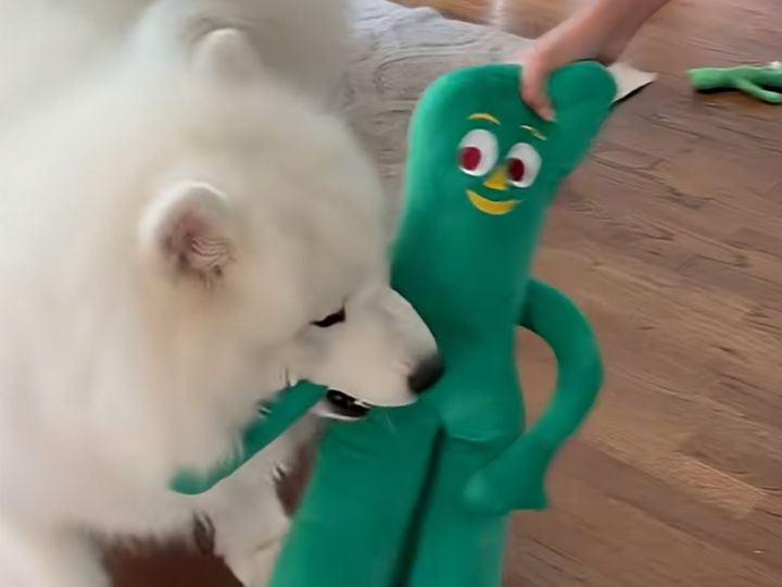 3. 新しいおもちゃに没頭するサモエド犬さん、全身で喜びを表現する姿が可愛い