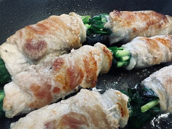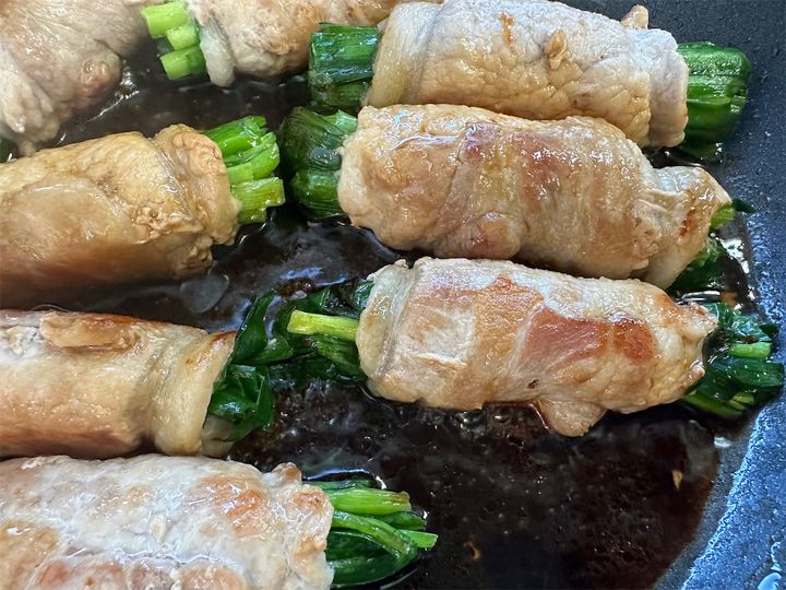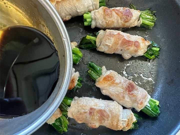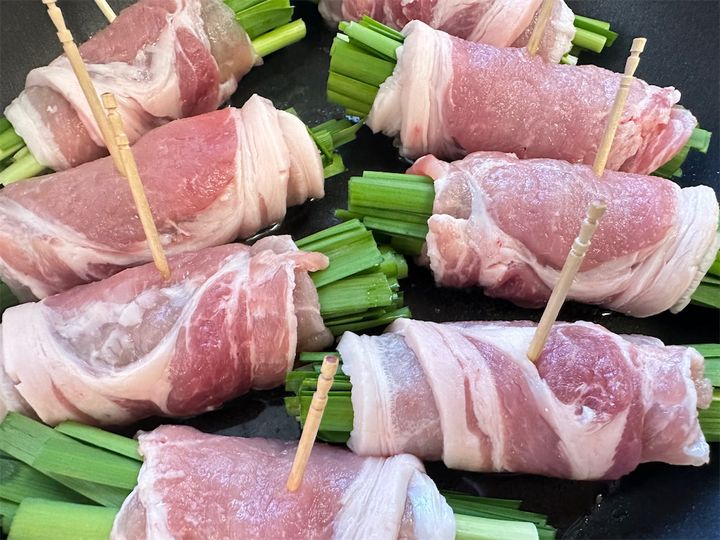 2. ニラの束を中心に豚肉を巻き、油をひいたフライパンの上で転がしながらじっくり焼きます。