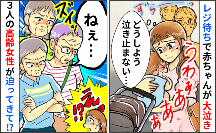 なかなか泣き止まない子どもに焦り、周りの方に申し訳なく思っていた私。すると、面識のない3人の高齢女性が子どものそばに来て、あやしてくださったのです。その間に私は会計と袋詰めまで終わらせました。