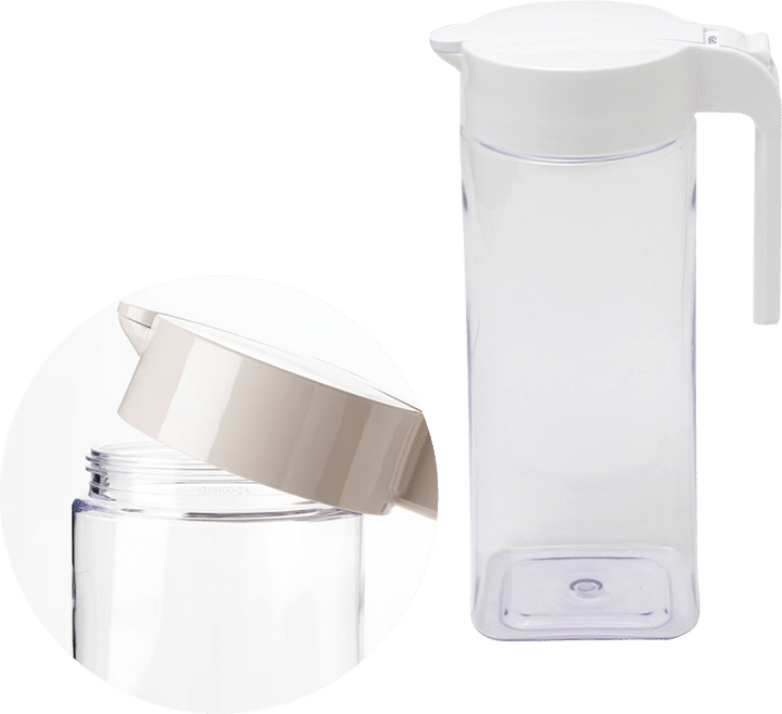 開閉もロックも片手でワンプッシュで可能な冷水筒。内側を洗いやすい広口タイプなのも嬉しい。冷蔵庫内に複数の冷水筒をストックしたい場合は、横置きできるのは大変便利。2.1L ¥799(ニトリ)