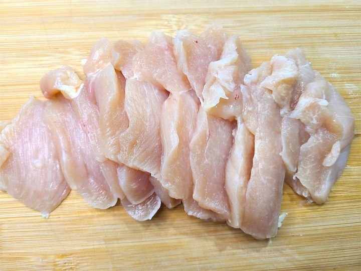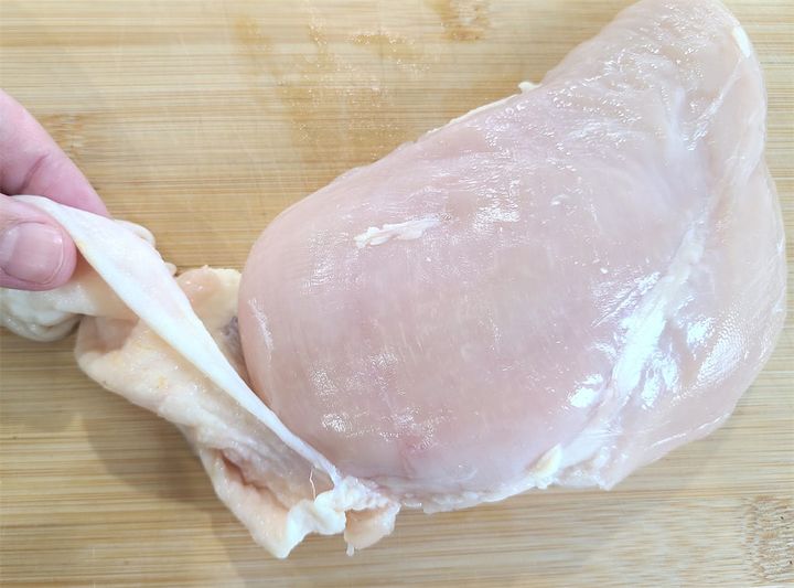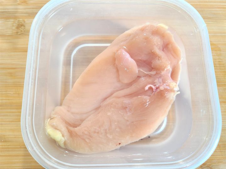 1. 鶏胸肉の余分な皮や筋を取り除きます。