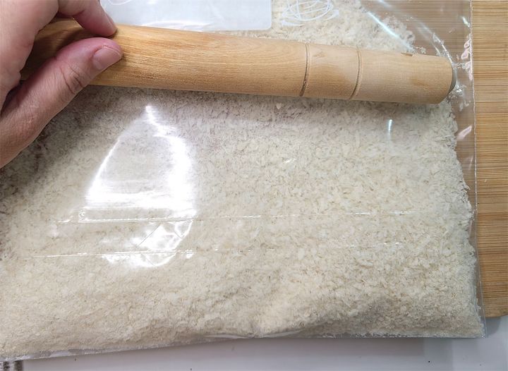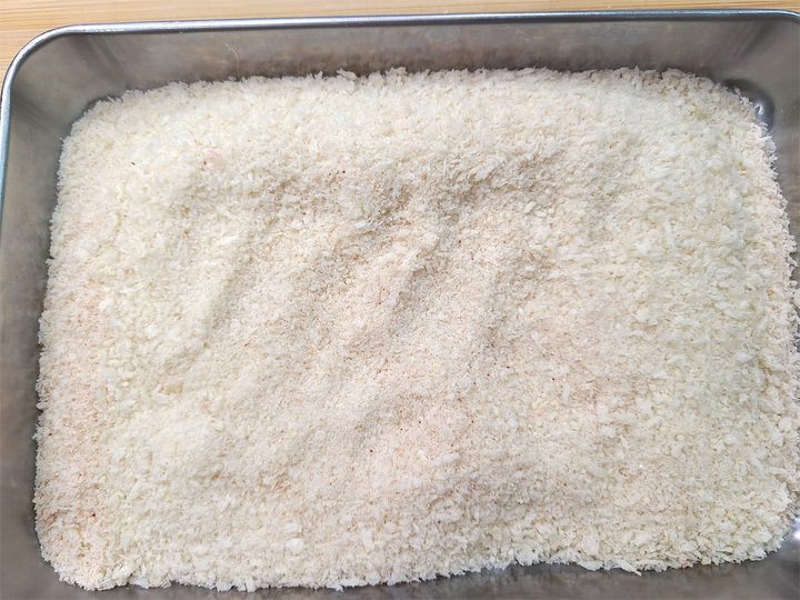 4. 平らなバットなどに衣の材料を混ぜ合わせます。パン粉はあらかじめ袋などに入れて細かくつぶしておきましょう。