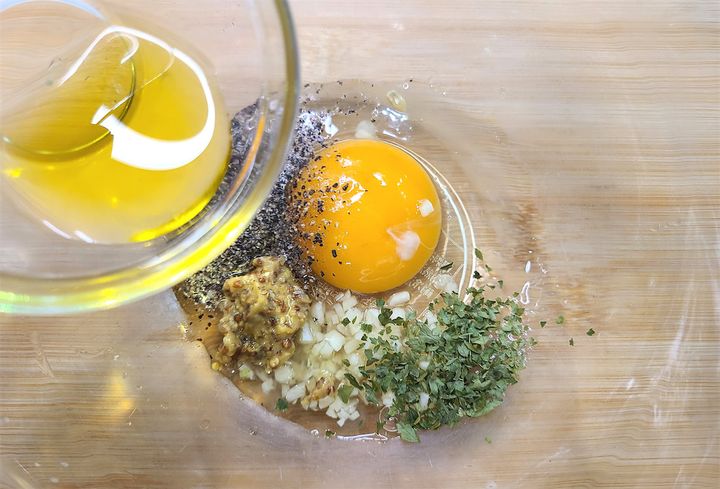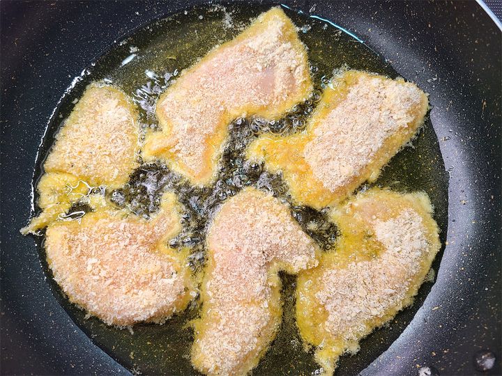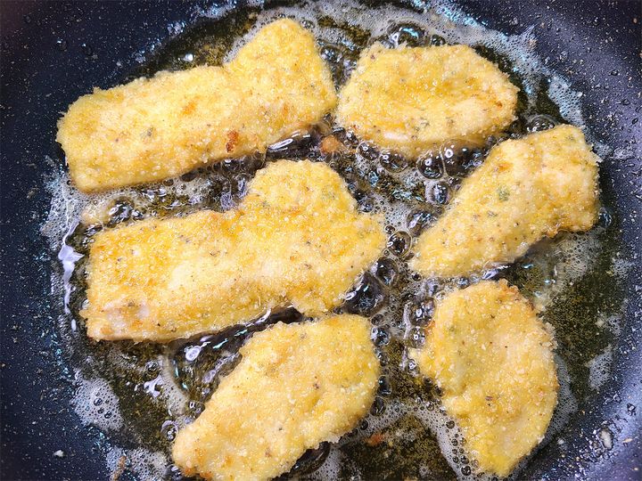7. フライパンにオリーブオイルを引いて中火にかけ、ある程度温まったら弱めの中火にして、4の衣をつけた6を揚げ焼きします。片面2分が目安です。