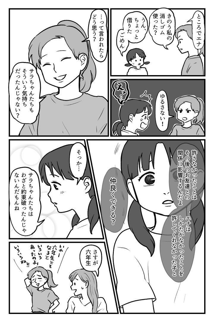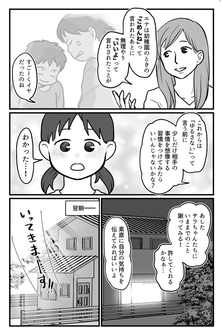 幼稚園のときに無理に許していたことがイヤだった経験から、「相手を許さない!」と頑なになってしまったエナ。でもこれからは相手の気持ちや状況を考えて、謝罪を受け入れることができるか考えてみる習慣をつけられると良いでしょう。エナは明日サラちゃんたちに今まで「許さない」と言ってしまったことを、謝ってみるそうです。