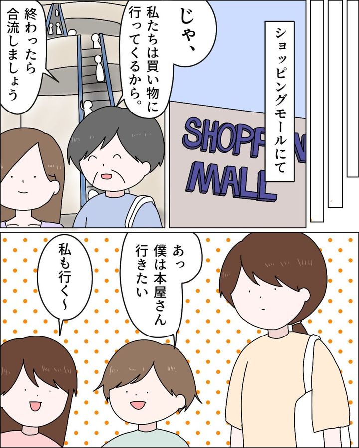 「じゃ、私たちは買い物に行ってくるから。終わったら合流しましょう」と笑顔で言う義母。そして、「あっ、僕は本屋さん行きたい」「私も行く~」と子ども達もそれぞれの要望を言い出しました。