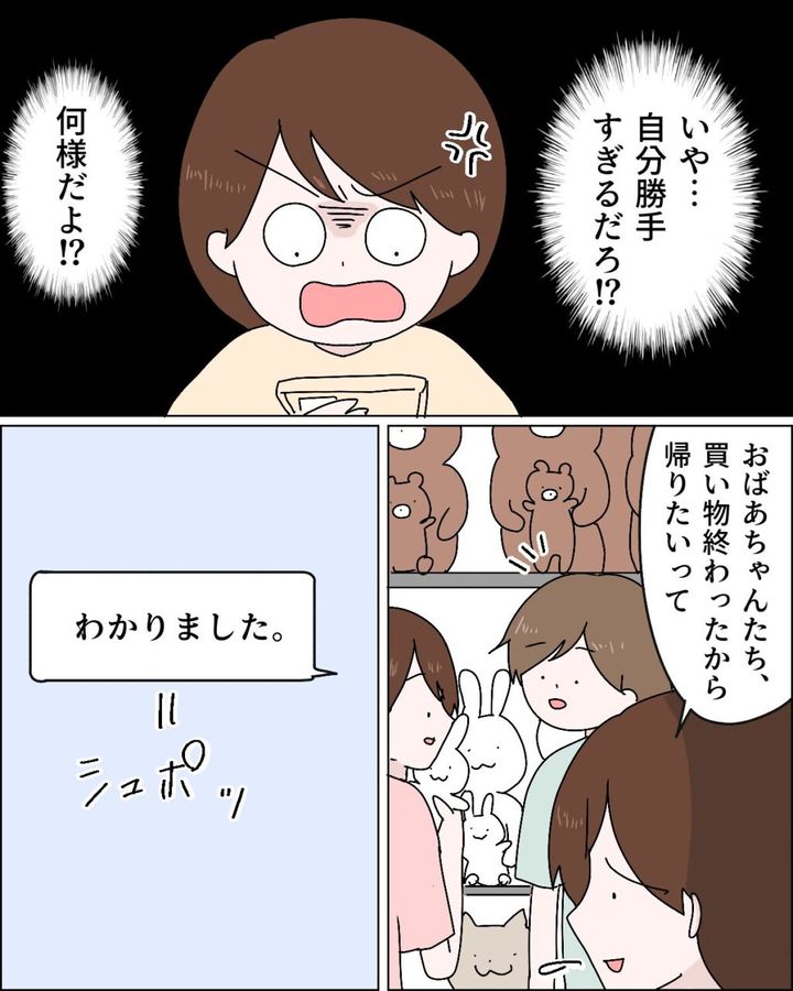 「いや・・自分勝手すぎるだろ!?何様だよ!?」と怒りがこみ上げた私ですが、仕方なく「おばあちゃんたち、買い物終わったから帰りたいって」と子ども達に伝えた後、「わかりました」とメッセージを送ったのでした。