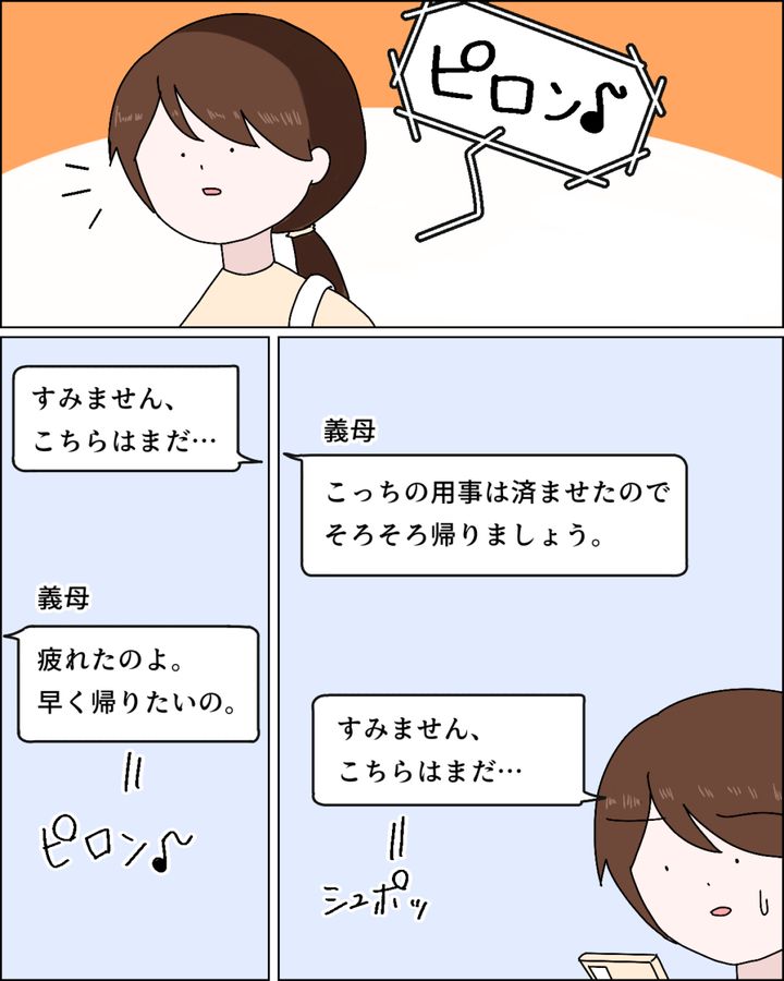 「義母:こっちの用事は済ませたのでそろそろ帰りましょう」と言われるもまだ無理だと「すみません、こちらはまだ・・」と伝えると、その後何度もメッセージが来て、「疲れたのよ。早く帰りたいの」と義母が言いました。