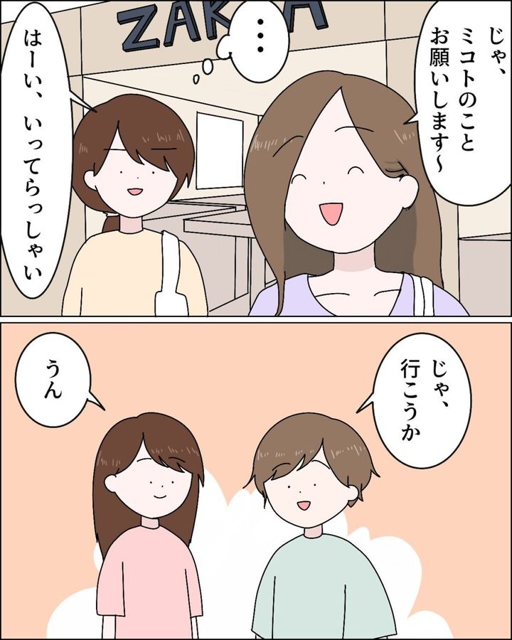 「じゃ、ミコトのことお願いします~」そう言って笑顔で去って行くミユキさんに無言になりながらも「はーい、いってらっしゃい」と見送りました。すると、「じゃ、行こうか」ミコトくんがイロハに声をかけ、「うん」とイロハも返事をしました。