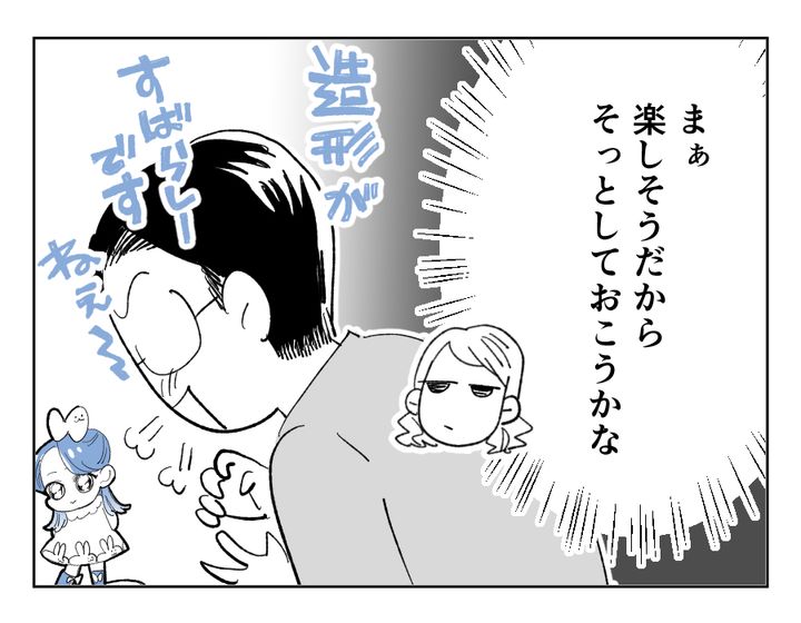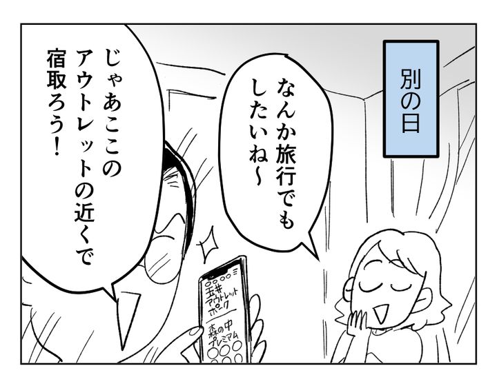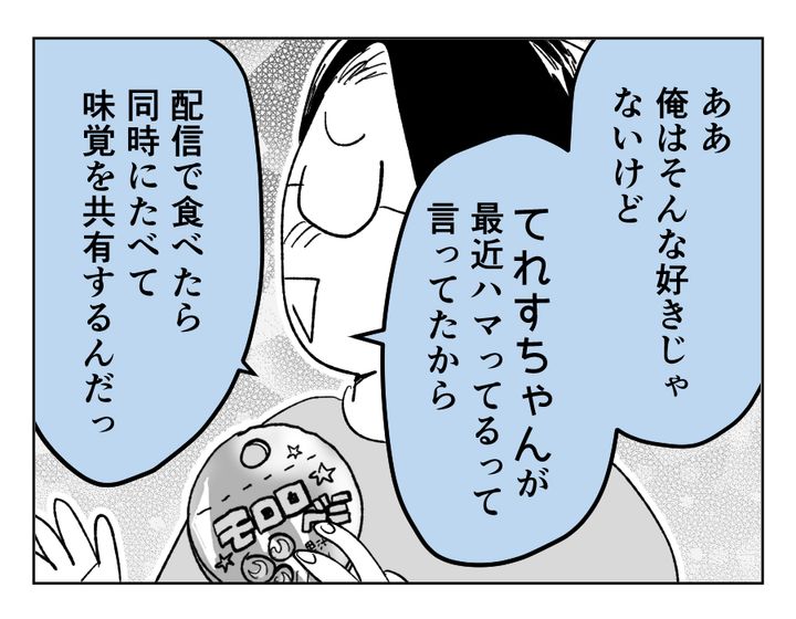 買ってくるおやつも、行きたい場所も、すべててれすちゃんに影響されはじめてきたタカユキさん。いままでは微笑ましく見守っていたクルミさんでしたが、だんだん雲行きが怪しくなってきました。たしかに家族水入らずで楽しく旅行したいと言っているのに、好きなVtuberの聖地巡礼をメインとされてしまっては、面白くないと感じるのも仕方のないこと。クルミさんの「ちょっと嫌だな」と思う気持ち、早くタカユキさんが気付いてくれるといいですね……。
