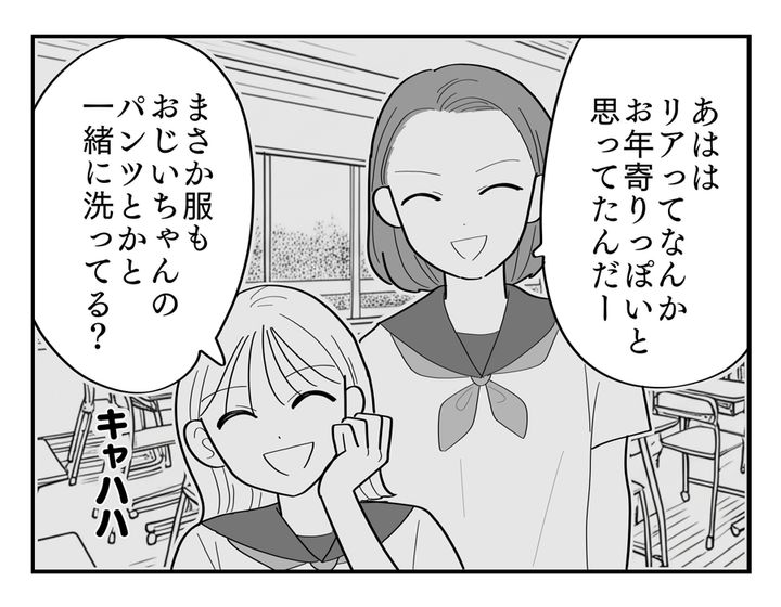 ソノミさんは結婚以来、十数年にわたって義実家で同居生活をしています。義両親や夫のダイキさんは優しく、日々の暮らしは平穏そのものでした。しかしある日、反抗期の娘・リアちゃんが「自分と祖父母の洗濯物を一緒に洗わないで」という主張をしてきました。しかもその理由は「汚い」「ニオイが移りそう」など理不尽とも思えるもの。ダイキさんに叱られて、毎日自分で洗濯しはじめたリアちゃん。ソノミさんが見守っていると、「実は友だちにからかわれていた」と打ち明けてきて……?