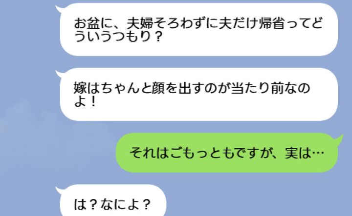 「お盆なのよ!? いつもとは違うのよ!? 親戚一同が集まっているっていうのに、顔も出さないなんて……」「親戚みんなに『息子さん、結婚したんですよね? 奥さんは来てないんですか?』なんて聞かれて……私は顔から火が出そうだったわよ! ほかのとこの奥さんはみんな来てるっていうのに……」と義母。