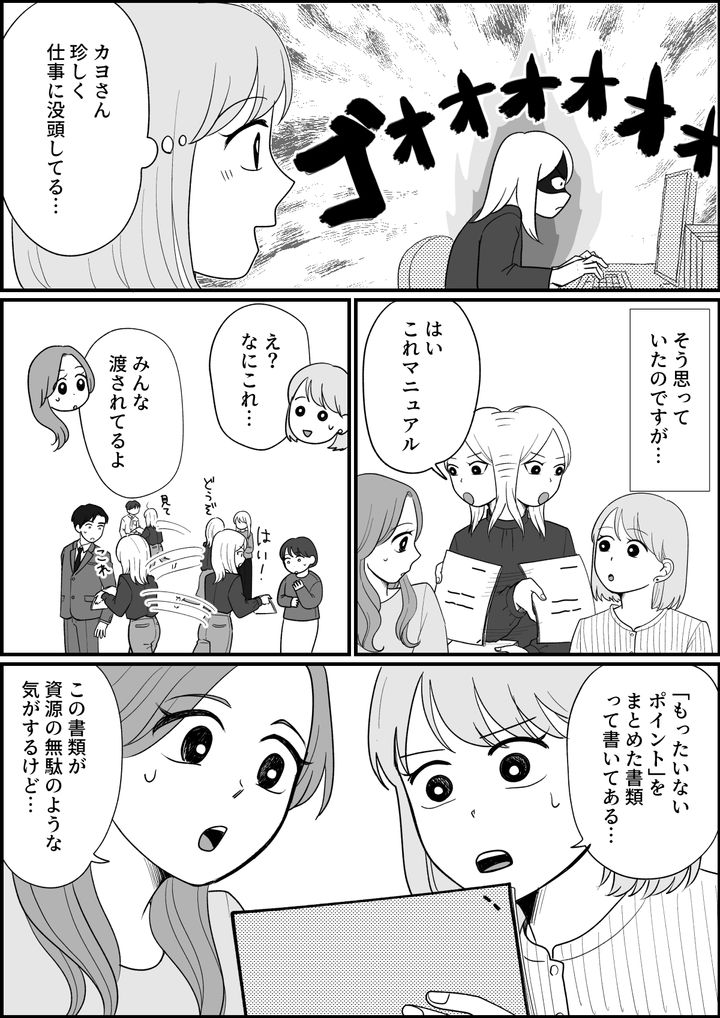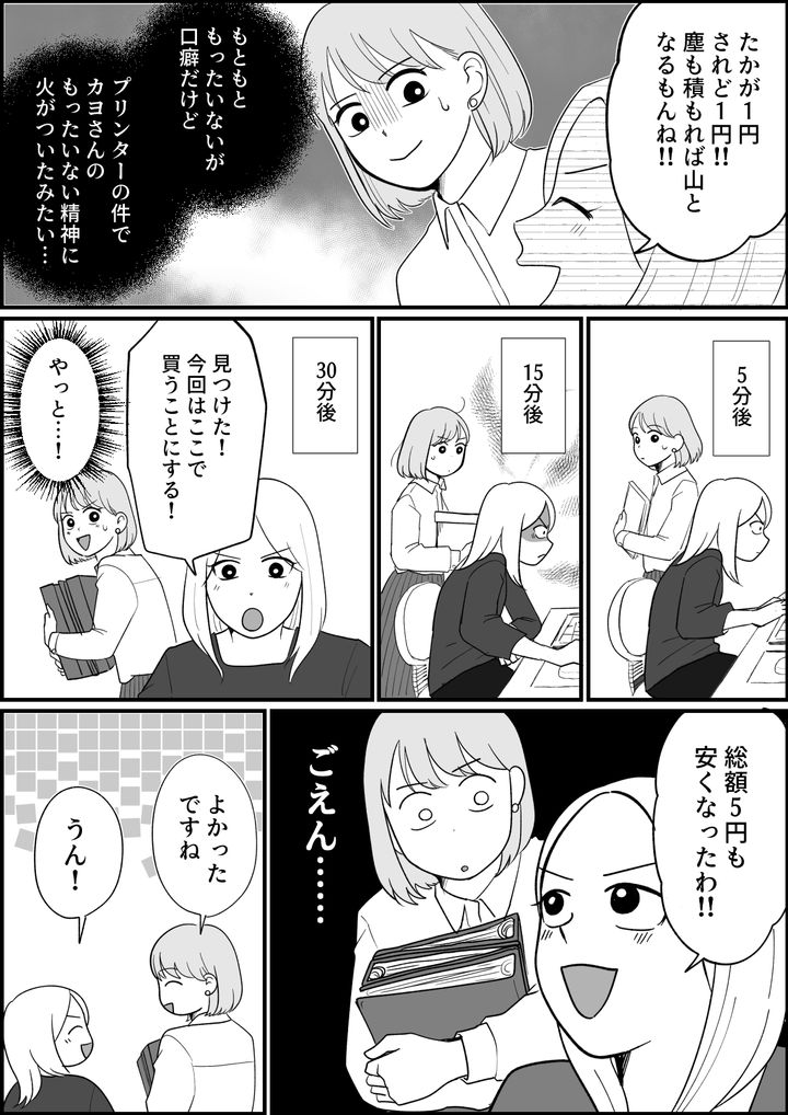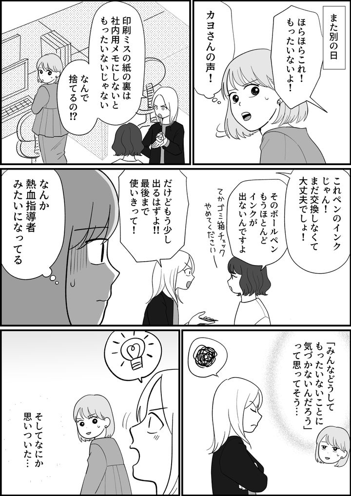 印刷ミスの紙の裏は社内用メモにできるから捨てちゃダメ! ボールペンも完全に書けなくなるまでは捨てない! カヨさんはみんなのもったいない行動に目を光らせています。「みんなどうしてもったいないことに気づかないんだろう?」とでも言いたげな表情でなにやら考え込んでいます。