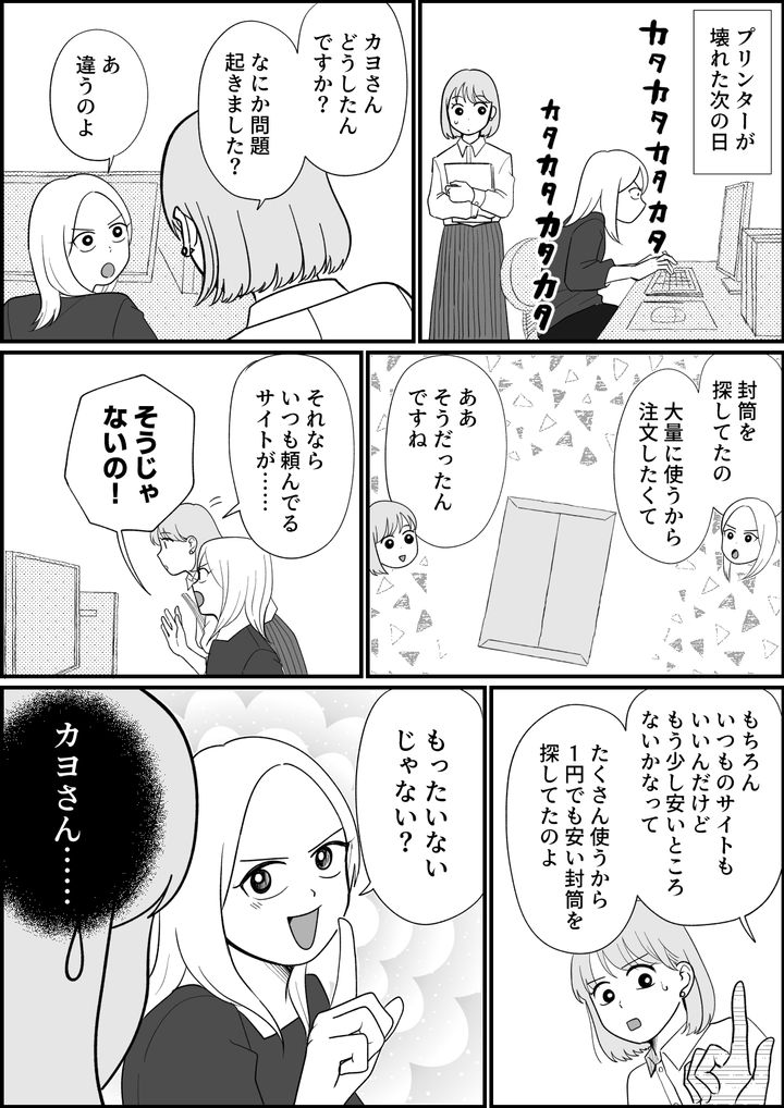 私はウイカ。プリンターが壊れているにもかかわらず、「まだ使える」と言い張って使い続けるカヨさん。紙詰まりを力ずくで直しながら印刷を続けていましたが、それでも何度も紙が詰まっています。しかしカヨさんは「もったいない」と言って、プリンターの買い替えを断固拒否の姿勢です。ナナコさんから仕事を頼まれても、「悪いけど今は印刷で手一杯なの」と断っていました。カヨさんは「もったいない」を言いすぎる癖さえなければ仕事ができる人なのに……困ったものです。